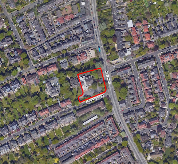 High Street and Graham Park Road. The site boundary is a high level stone wall